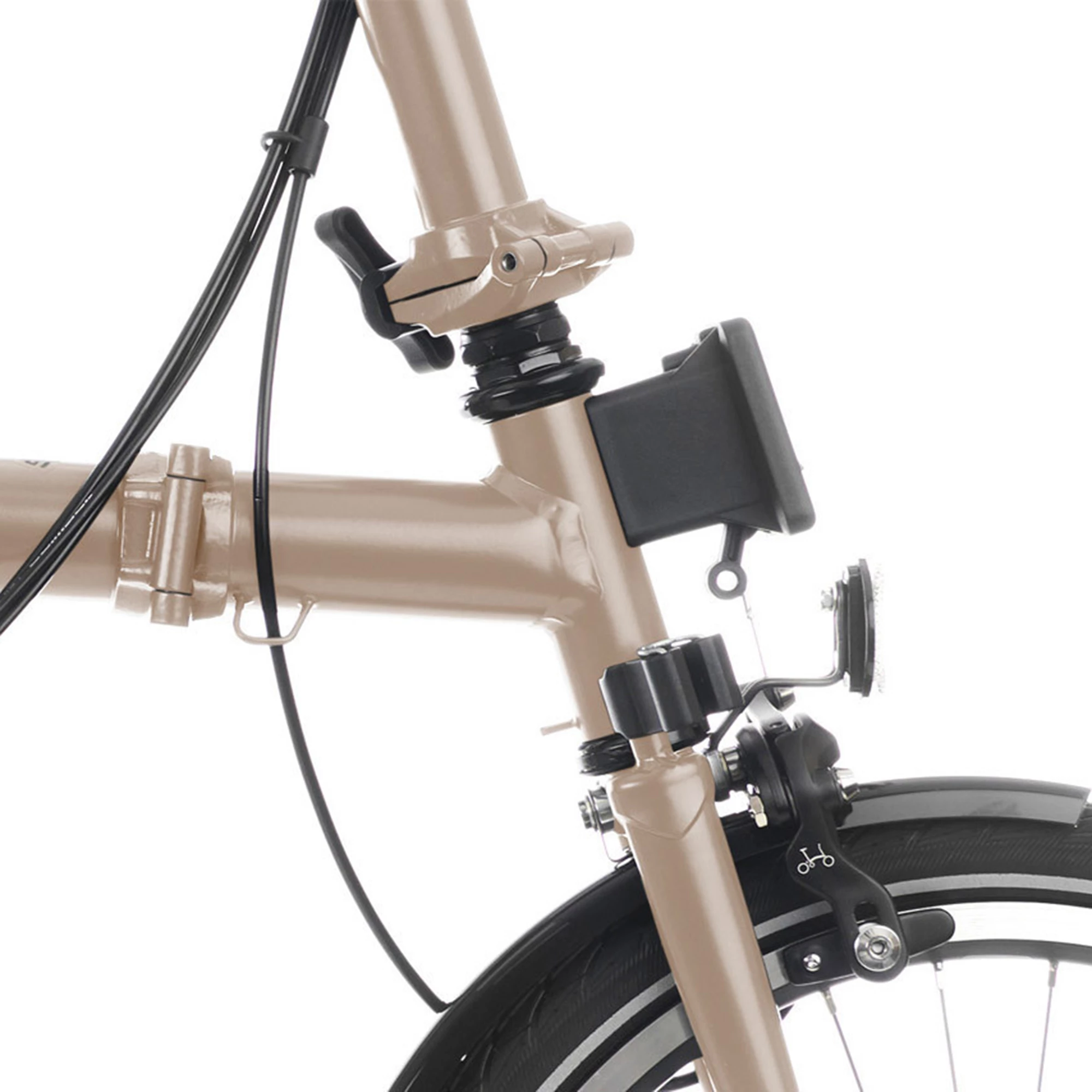 Handcrafted in Brompton’s London factory, the steel frame is finished with a durable powder coating, produced using over 90% renewable energy resources, reflecting Brompton’s commitment to sustainability.