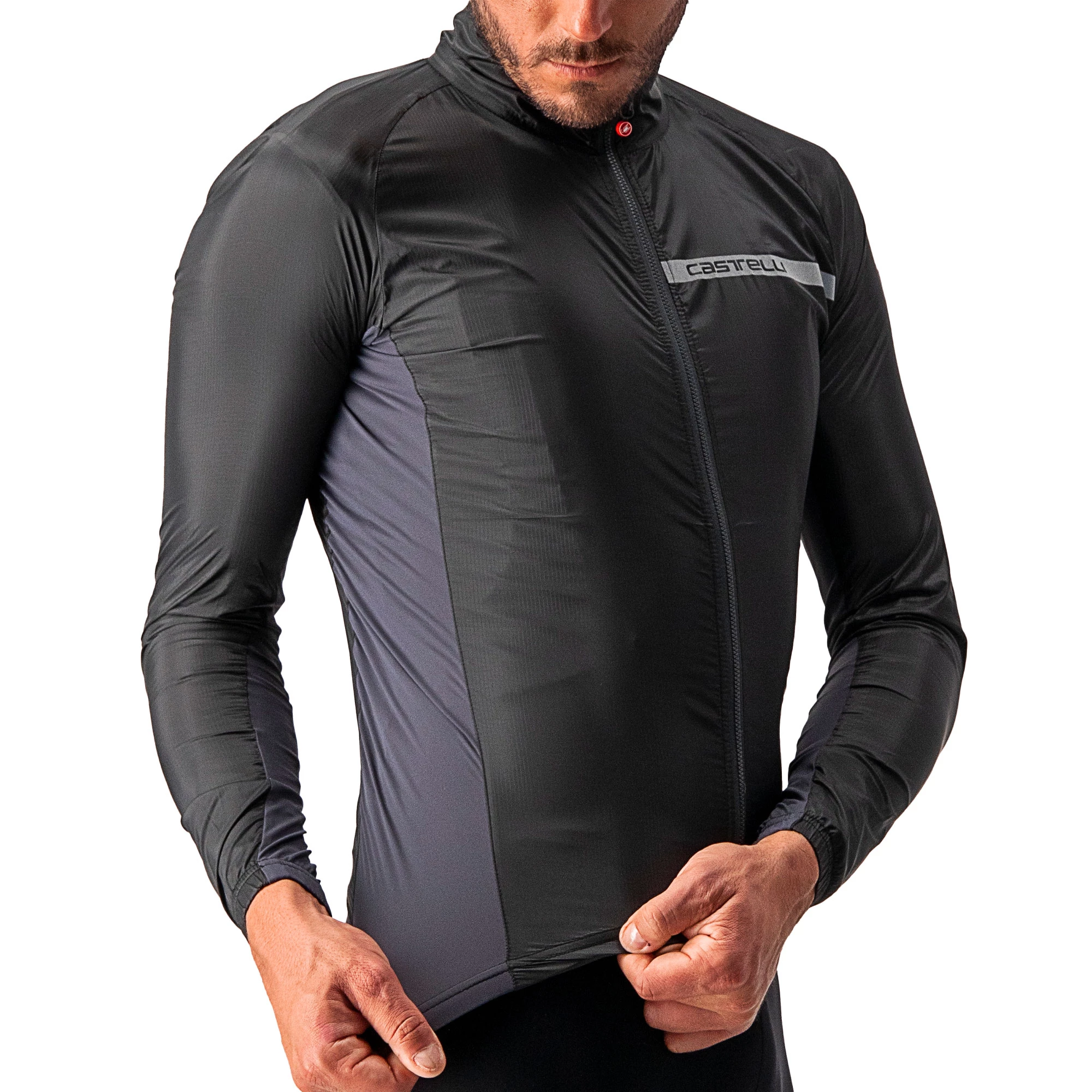 The Castelli Squadra jacket collar is high, preventing a draught at the neck, and the jacket is finished with reflective details front and back to improve safety in low light.