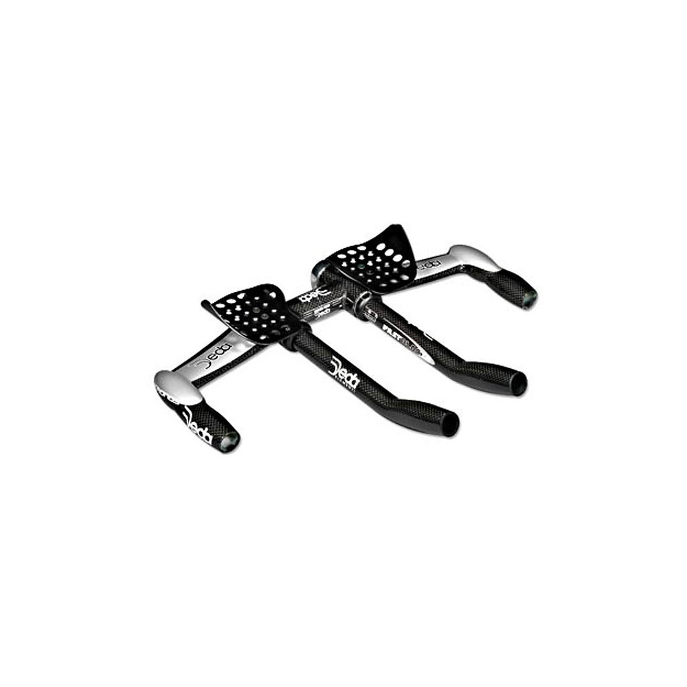 Deda's Kronos bar offers the most advanced aerodynamic position with the best ergonomic hand grip. This streamlined flat design in carbon fibre has adjustable (both length and angle) and removable arm rests.