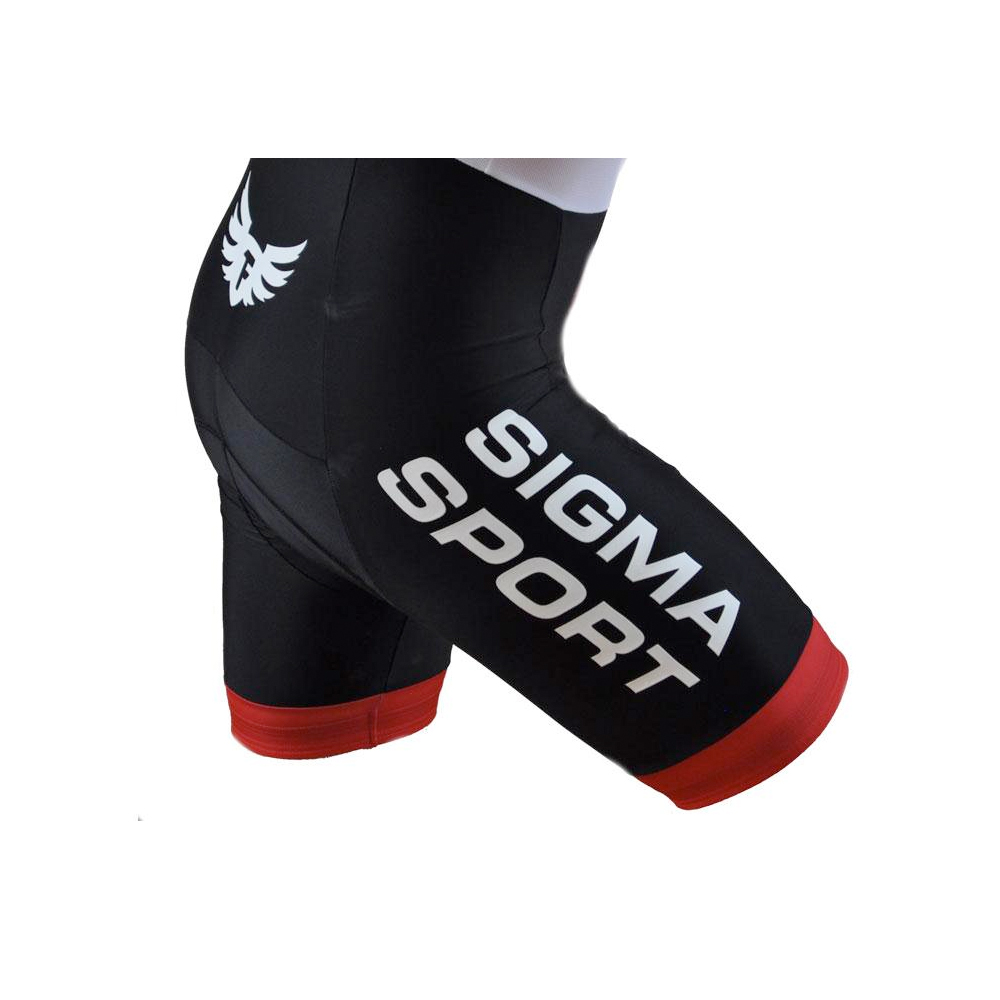 Team La Fuga Sigma Sport bibshorts made by Pissei in Italy. It features the La Fuga logo on the back and Sigma Sport adorns the thighs.