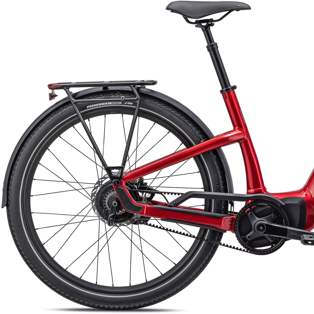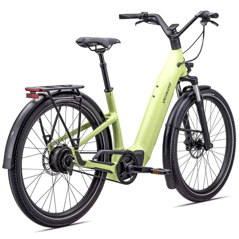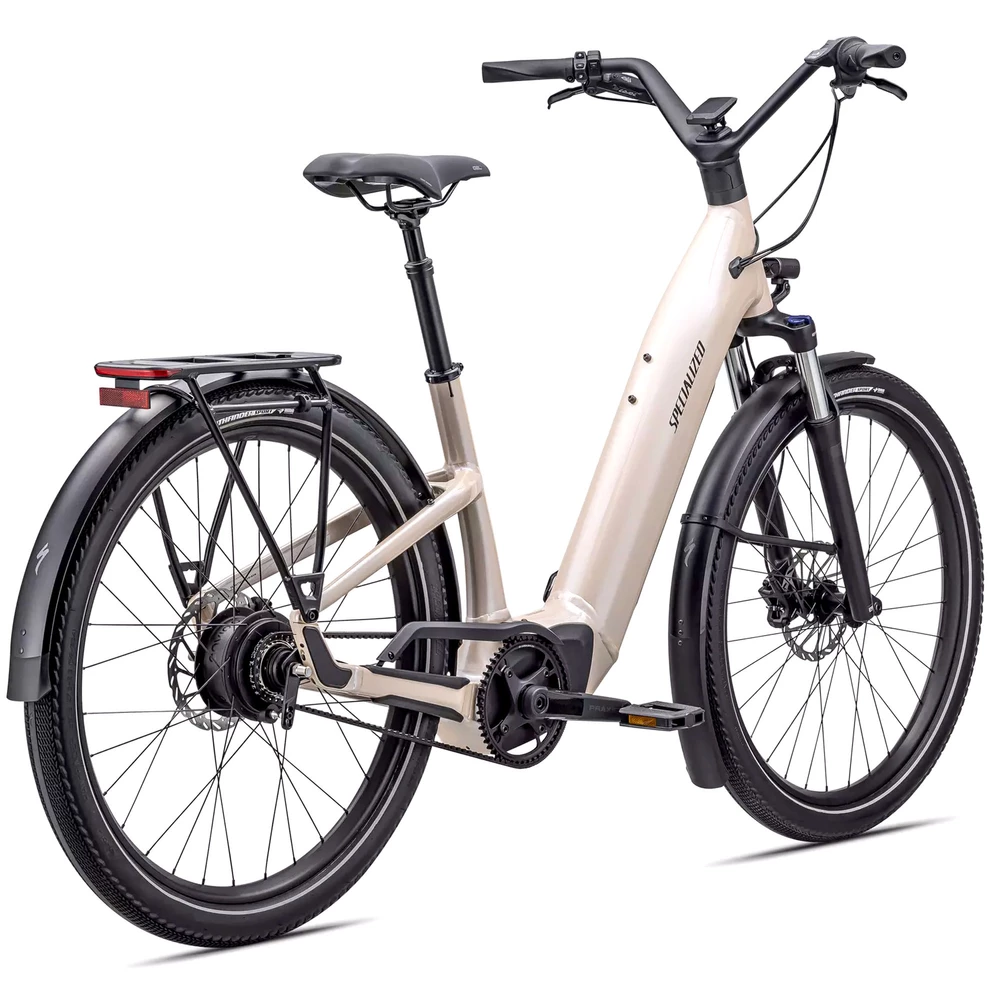 Powerful hydraulic disc brakes enhance control on steep descents, and wide Specialized Pathfinder tyres offer excellent traction across a range of surfaces. The wheels are durable and feature a double-wall rim for extra strength, and DRYTECH mudguards, a rear pannier rack and a kickstand are included for added convenience.