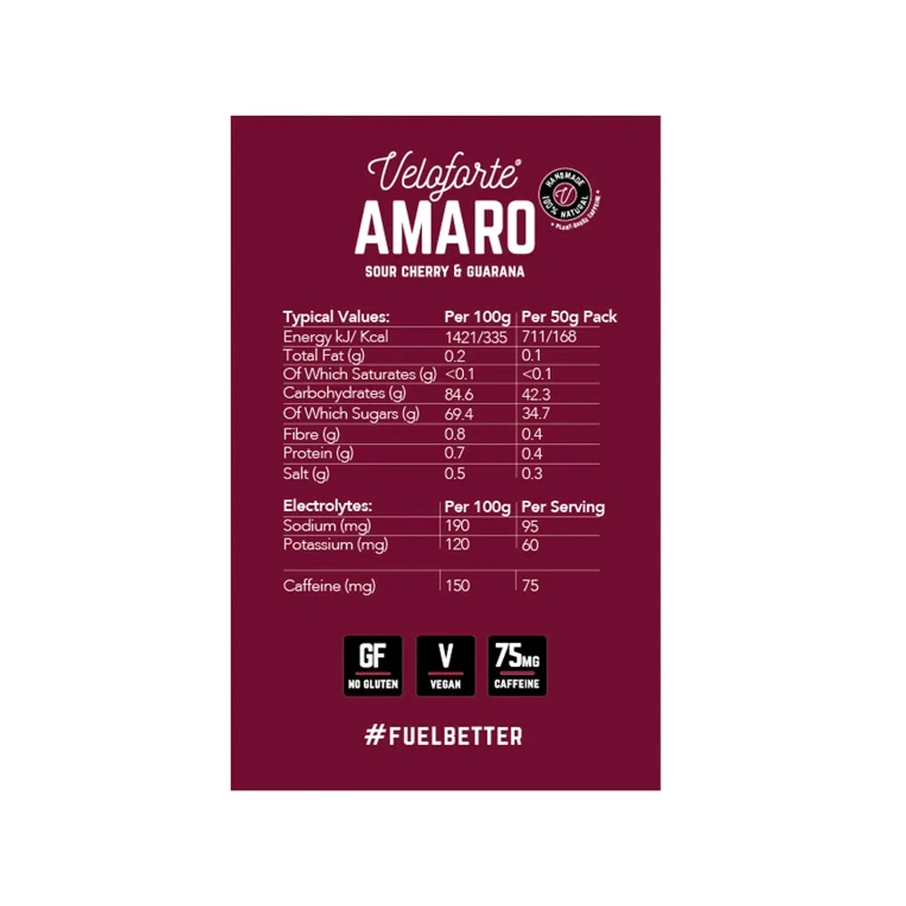 The Veloforte Amaro Cubos Energy Chews with Caffeine Box of 12 have a delicious sour cherry flavour, and each pack of six chews delivers 42 grams of carbohydrates from glucose and fructose, alongside 72mg of caffeine from guarana. Effectively boosting energy and increasing alertness, you'll be able to perform better no matter your sport, and electrolytes lost from sweat are replaced thanks to the inclusion of sodium and potassium from pink Himalayan salt and dried coconut water.