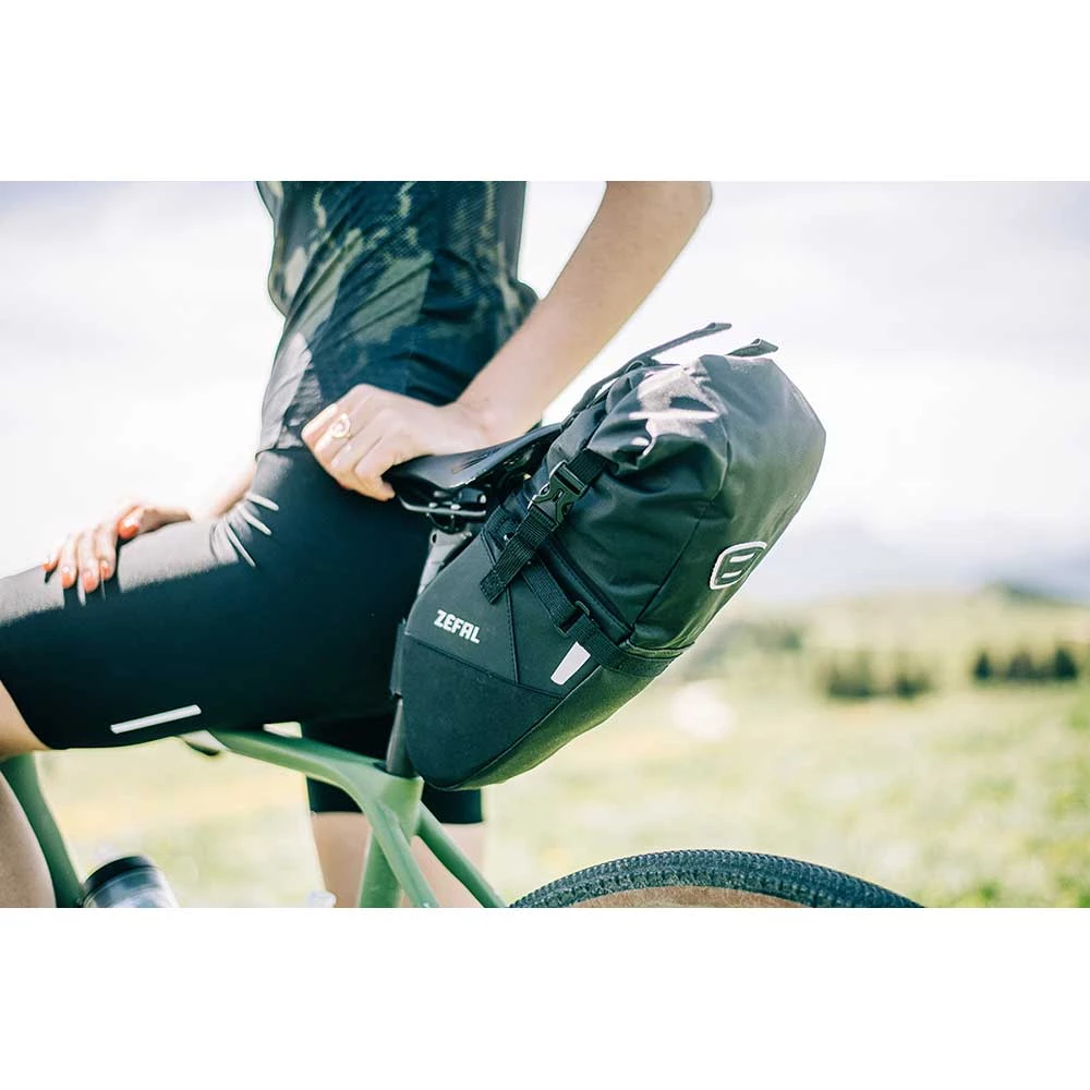 The Z Adventure R5 is a saddle bag designed to carry a large volume of items without the need for a rear rack. Equipped with several durable self adhesive straps and anti-tear material on its base, this bag attaches to the saddle rails and seat post for optimal weight distribution on the bicycle. The 5L volume is ideal for day-long outings or for training in variable weather conditions. The Z Adventure R5 is a great alternative for those who don't want a backpack. The folding closure and waterproof fabric with heat-sealed interior can safely carry all the equipment needed for a tour.